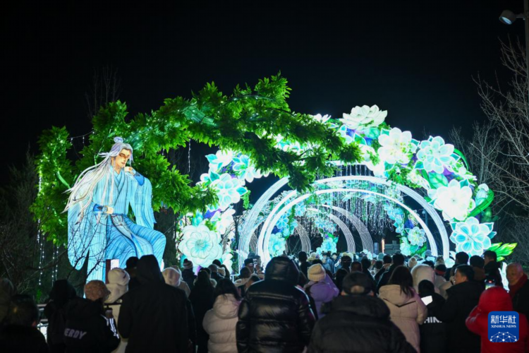 2月12日,在北京市溫榆河公園舉行的“2025北京千燈夜”上,游客觀賞花燈作品。
