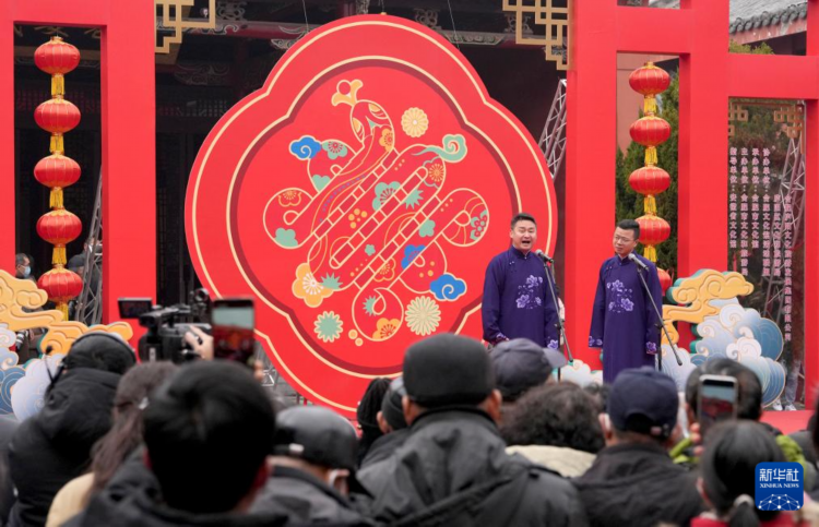 2月12日,在安徽省合肥市城隍廟內,市民在“歡天喜地鬧元宵”新春文化廟會上觀看相聲節目《廬韻包公》。