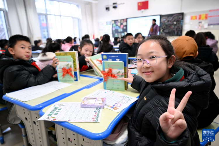 2月16日,寧夏銀川市興慶區實驗二小學生在展示領到的新課本。