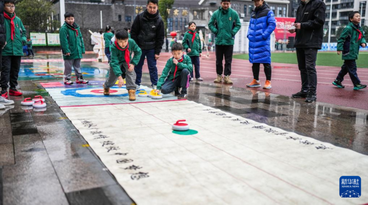 2月17日,貴陽市實驗小學未來方舟分校的學生在體驗旱地冰壺。