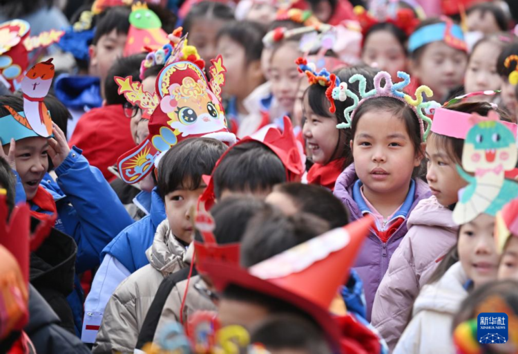 2月17日,在天津市和平區新星小學,學生們頭戴蛇年裝飾參加開學典禮。