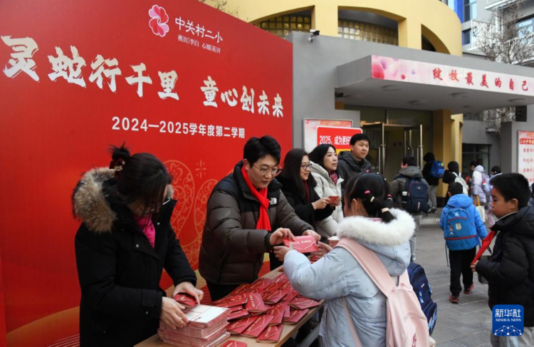 2月17日,在北京市海淀區中關村第二小學(華清校區),老師為學生發放裝有新學期寄語的“成長紅包”。