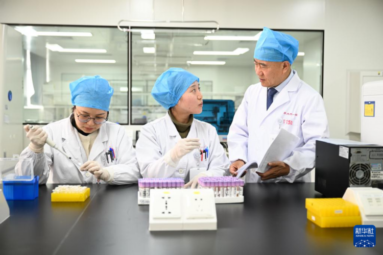 在位于蘇州大學附屬第一醫院的國家血液系統疾病臨床醫學研究中心HLA配型實驗室,吳德沛(右)和研究人員討論造血干細胞供者選擇方案(2025年2月17日攝)。