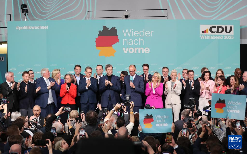 這是2月23日,在德國柏林的基督教民主聯盟總部,聯盟黨總理候選人默茨在出口民調顯示領先后接受祝賀。新華社記者 杜哲宇 攝