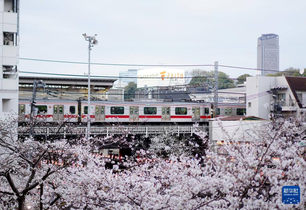 3月30日,一輛電車駛過日本首都東京目黑川畔盛開的櫻花。