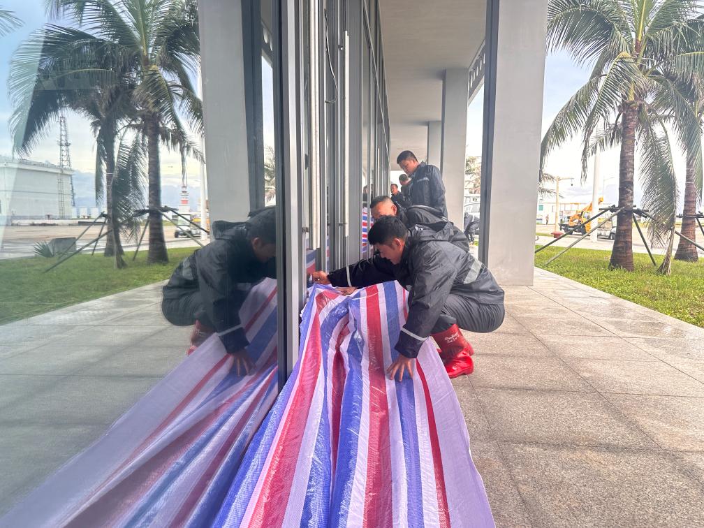 6月11日,三沙市工作人員正在對(duì)文體館進(jìn)行防風(fēng)防汛處理。(三沙市新聞中心供圖)