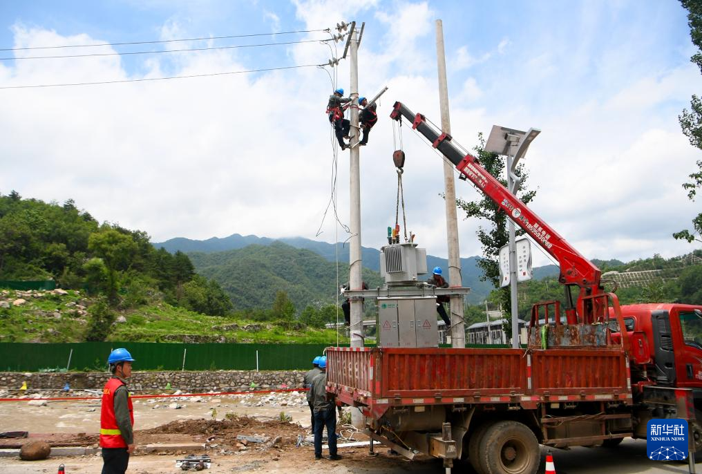 7月2日,西峽縣電力部門工作人員在太平鎮(zhèn)搶修電路。
