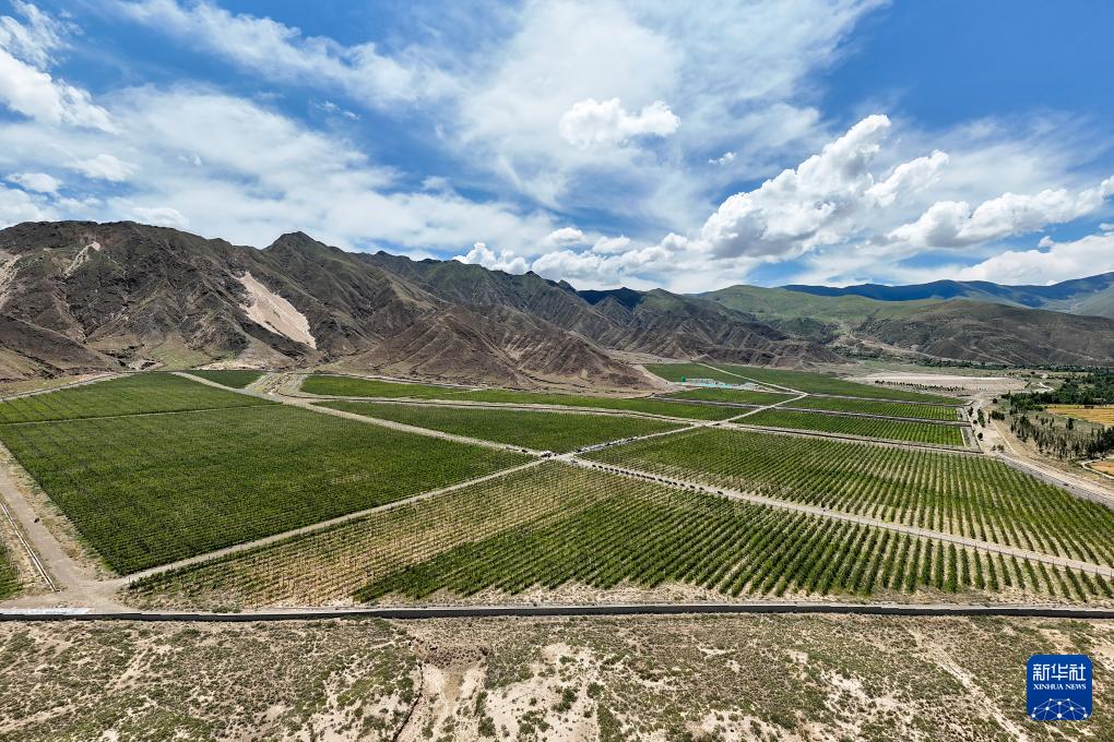 這是西藏扎囊縣的一處矮化蘋果種植園區(qū),采用現(xiàn)代農(nóng)業(yè)滴灌技術(shù),使水資源得到高效利用,還可以用果樹防風(fēng)固沙,讓沙化地變綠洲(無人機照片,7月19日攝)。