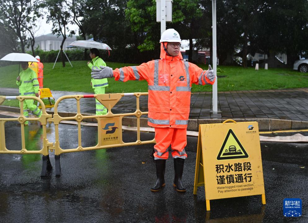 7月20日,工作人員在廣東深圳福田區積水路段指揮。