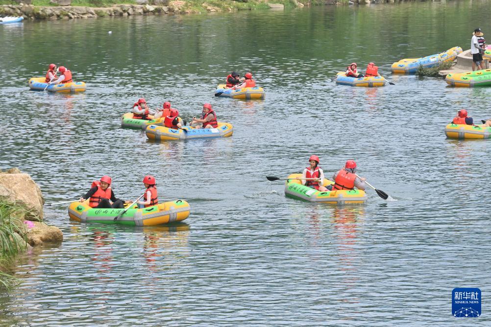游客在融水苗族自治縣香粉鄉雨卜村漂流消暑(7月20日攝)。