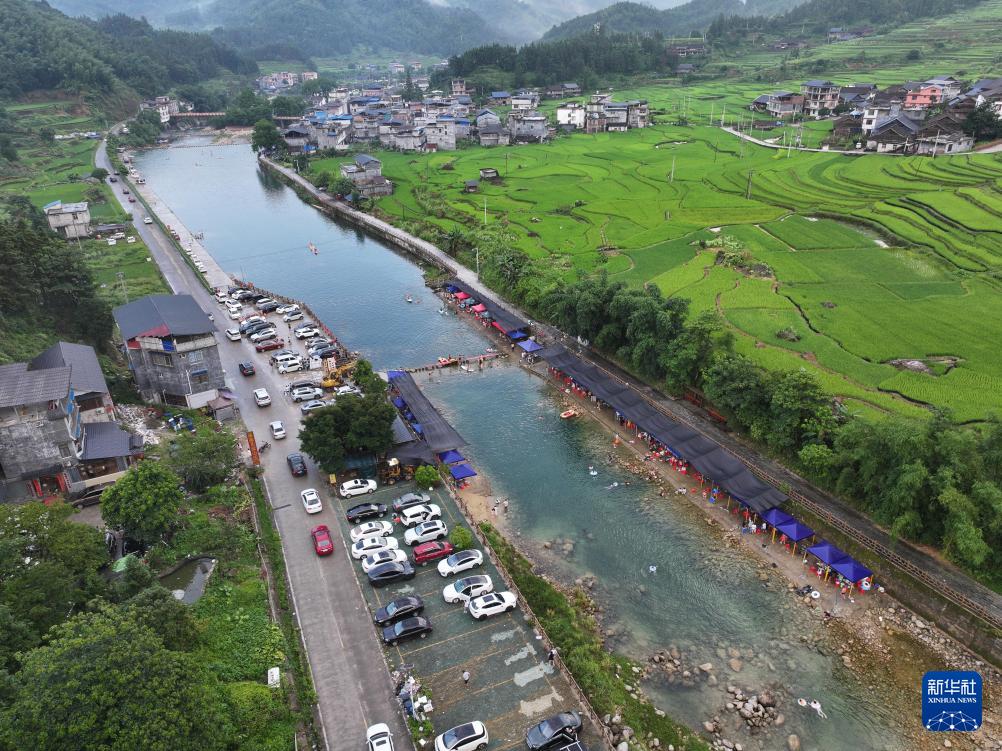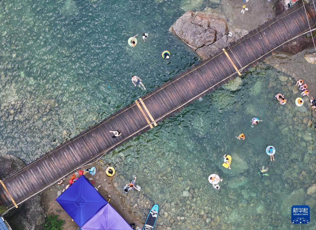 游客在融水苗族自治縣香粉鄉雨卜村戲水消暑(7月19日攝,無人機照片)。
