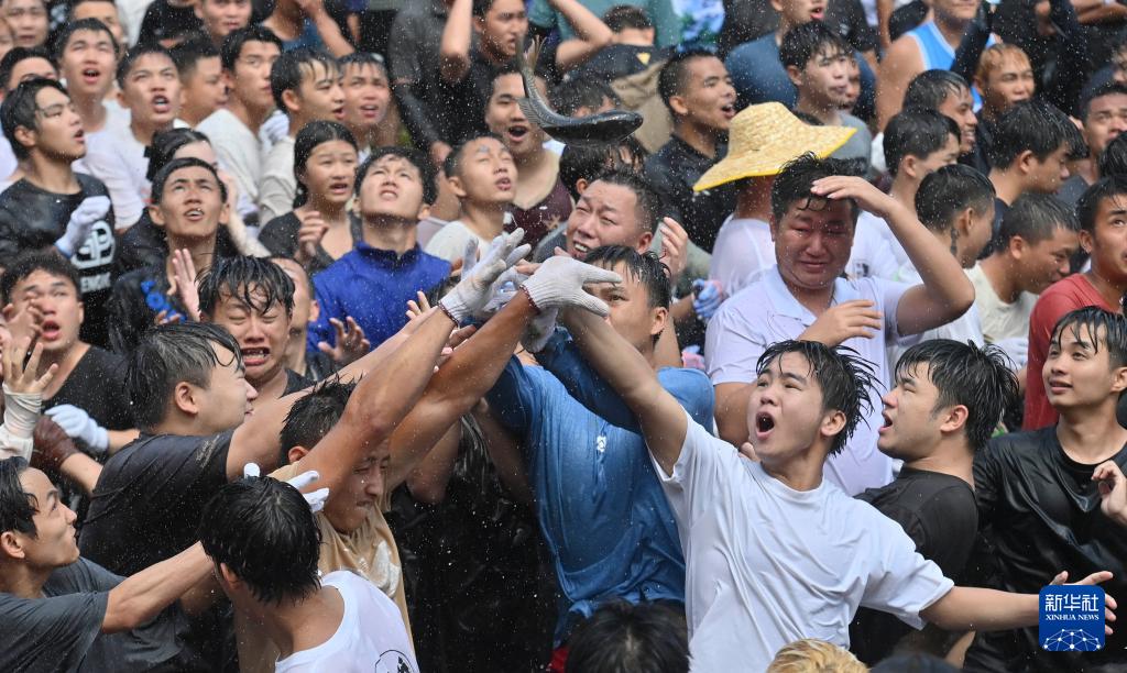 在融水苗族自治縣紅水鄉良雙村鬧魚節活動中,村民和游客在河里抓魚(7月10日攝,無人機照片)。