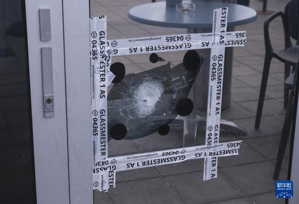 這是7月20日在挪威首都奧斯陸特韋塔購物中心拍攝的一處玻璃門上留下的彈孔。