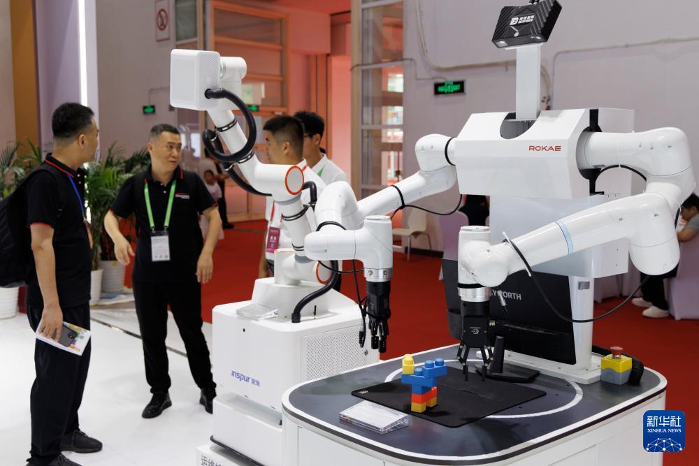 7月16日在第三屆中國國際供應鏈促進博覽會主賓省山東省展臺拍攝的具身智能雙臂機器人。