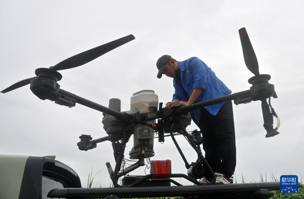 7月23日,在位于廣西上思縣的昌菱農(nóng)場蔗區(qū),技術(shù)人員操控?zé)o人機(jī)。