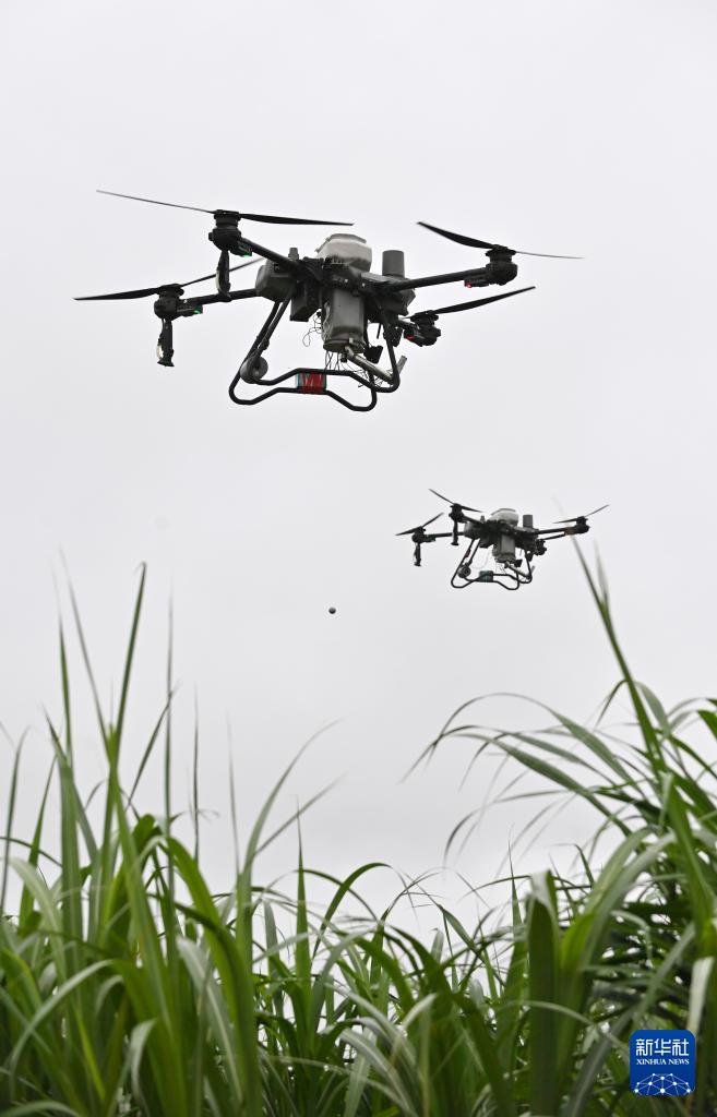 7月23日,在位于廣西上思縣的昌菱農(nóng)場蔗區(qū),無人機(jī)在飛行中釋放螟黃赤眼蜂球。