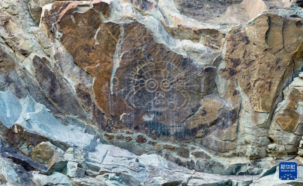 這是7月23日拍攝的賀蘭山巖畫(huà)景區(qū)內(nèi)著名的標(biāo)志性巖畫(huà)“太陽(yáng)神”(無(wú)人機(jī)照片)。