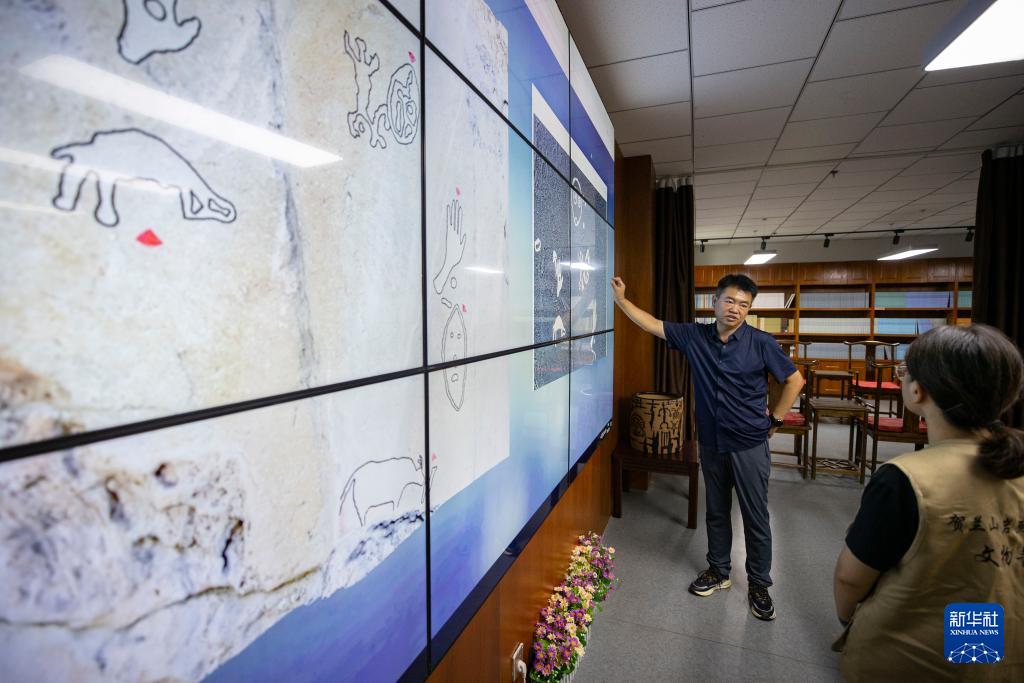 7月23日,工作人員在銀川世界巖畫館研究室研究賀蘭山巖畫數字拓片。