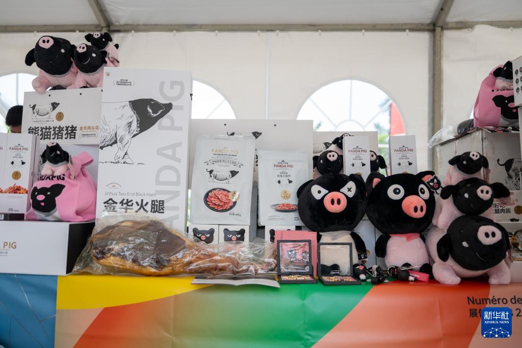 這是7月24日在加蓬首都利伯維爾舉行的中國-加蓬商品展覽會上拍攝的金華火腿和金華兩頭烏文創(chuàng)周邊產(chǎn)品。