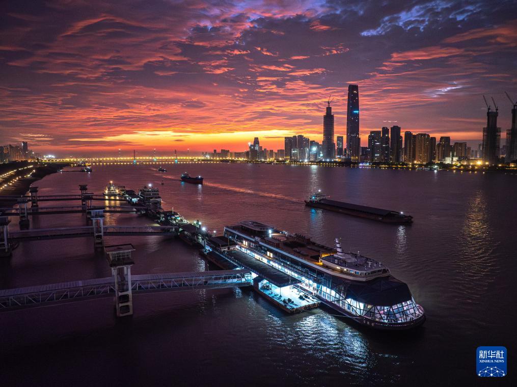 7月26日清晨,船舶伴著朝霞行駛在長江武漢江段(無人機照片)。