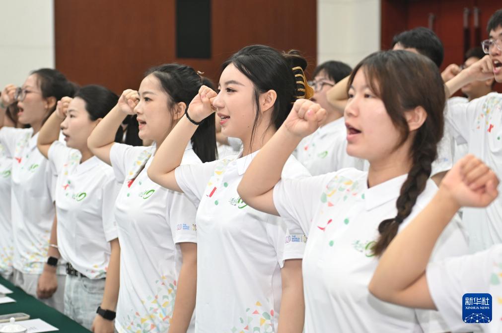 7月28日,志愿者們?cè)诔啥际肋\(yùn)會(huì)志愿者誓師大會(huì)上宣誓。