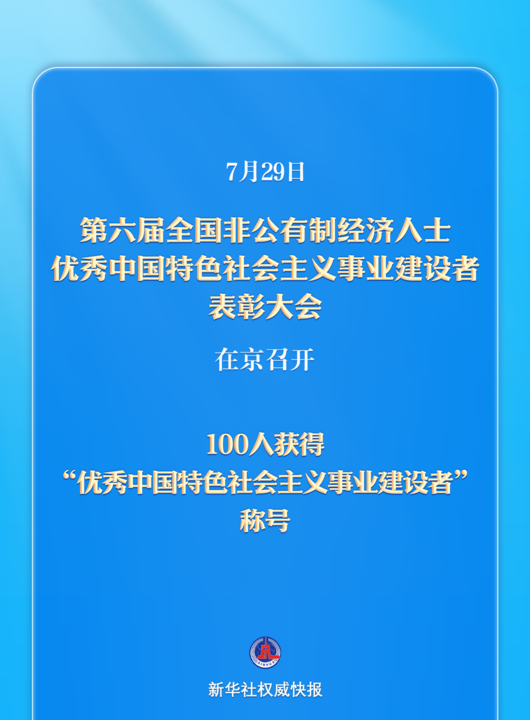 7月29日,第六屆全國非公有制經濟人士優秀中國特色社會主義事業建設者表彰大會在京召開。100名非公有制經濟人士和新的社會階層人士獲得“優秀中國特色社會主義事業建設者”稱號。