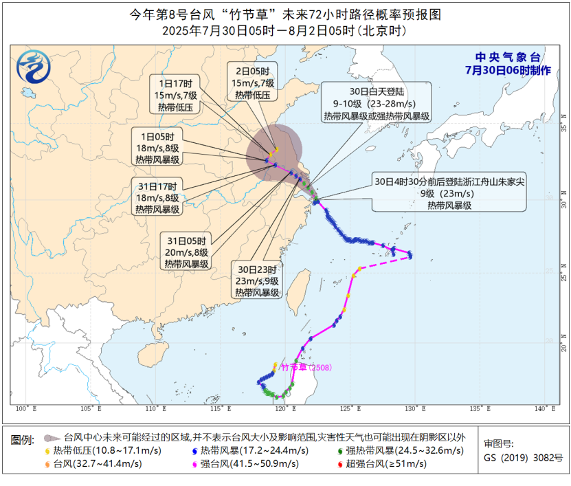 預計,“竹節草”將以每小時10-15公里的速度向北偏西方向移動,強度將有所增強,將于30日白天在浙江寧波到江蘇啟東一帶沿海再次登陸(23-28米/秒,9-10級,熱帶風暴級或強熱帶風暴級),登陸后強度緩慢減弱。