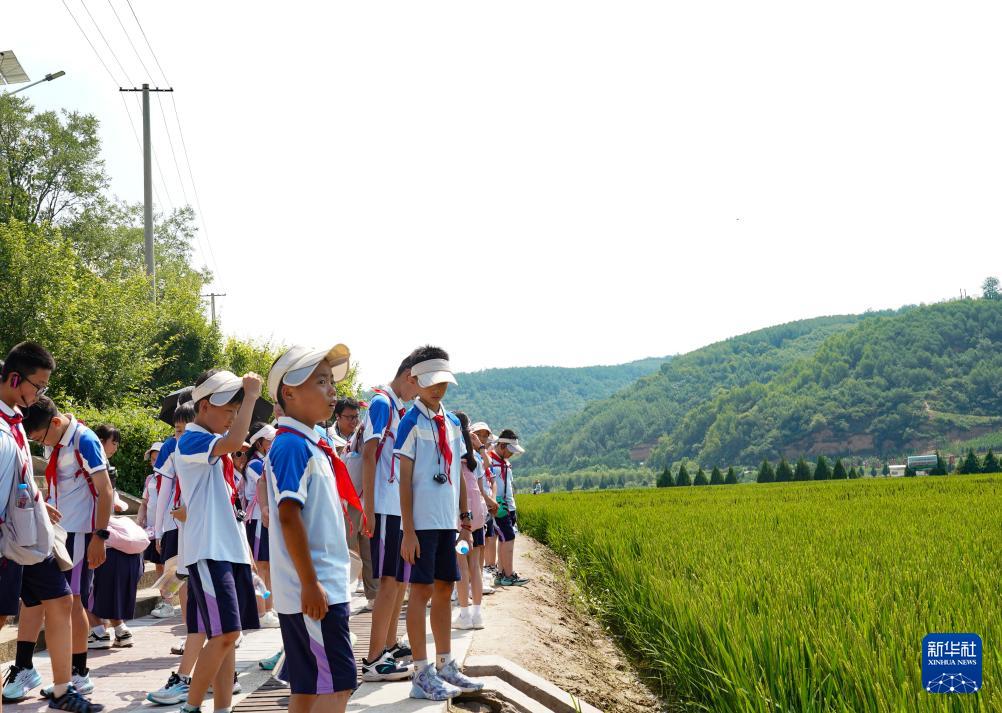 小學(xué)生研學(xué)團在南泥灣千畝稻田景觀前駐足觀賞(7月29日攝)。