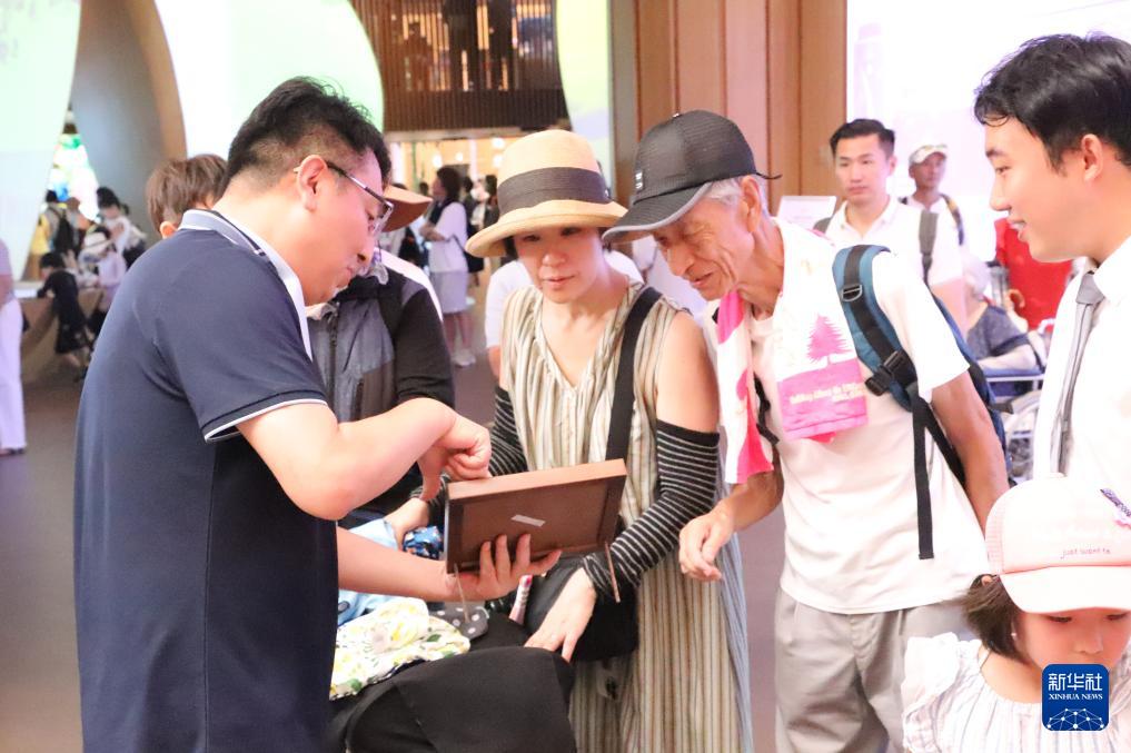 7月30日,在日本大阪世博會中國館,工作人員為中國館第100萬名參觀者淺川一家介紹中國館山東活動周展陳。新華社記者 李子越 攝