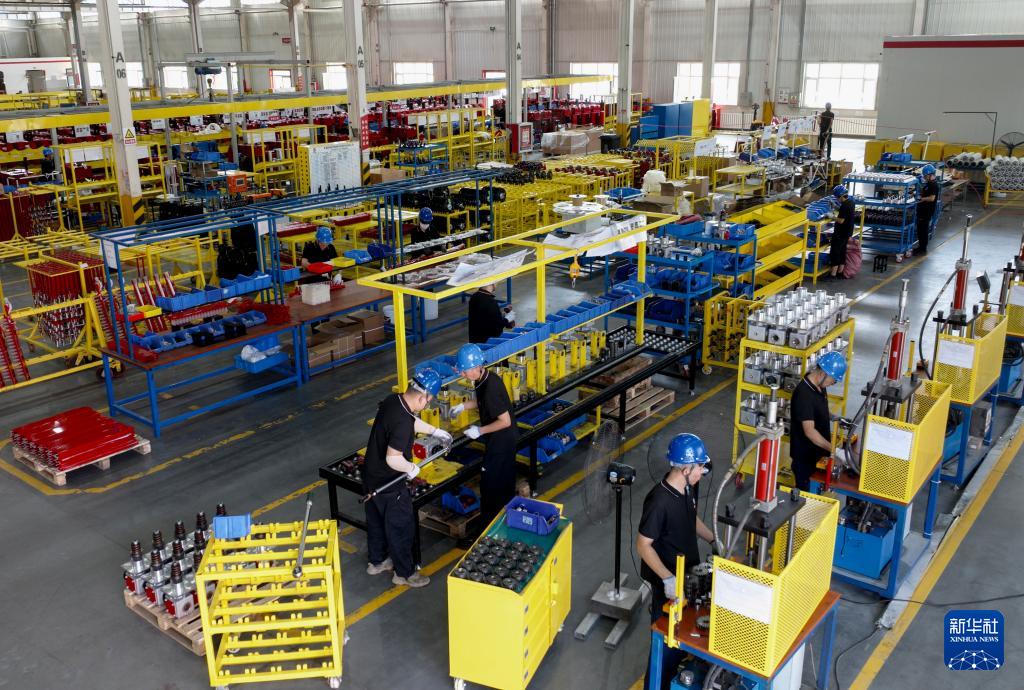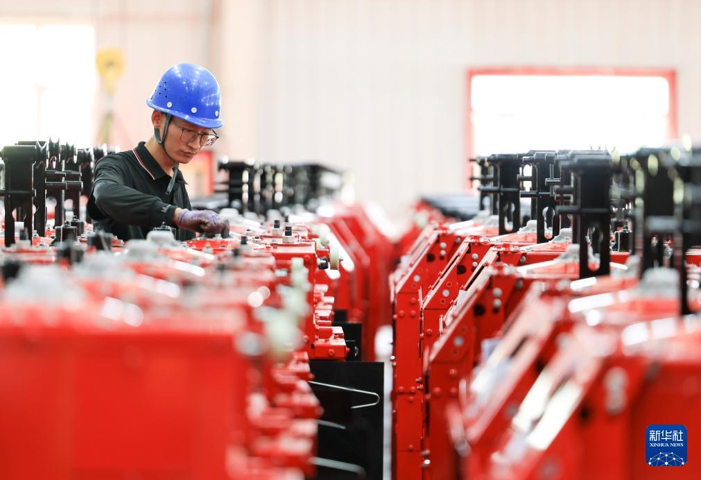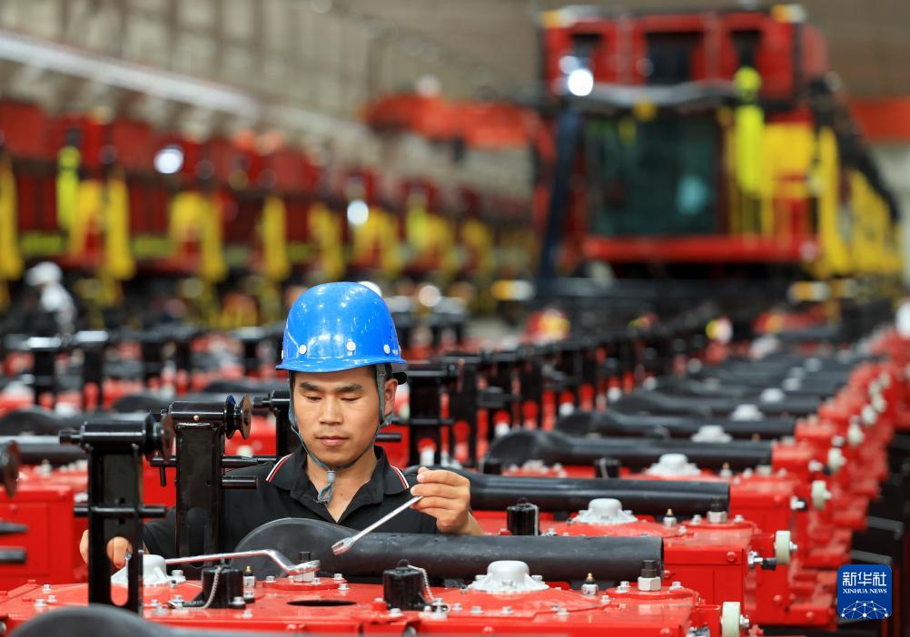 7月29日,工人在新疆缽施然智能農機股份有限公司的采棉機生產車間組裝配件。