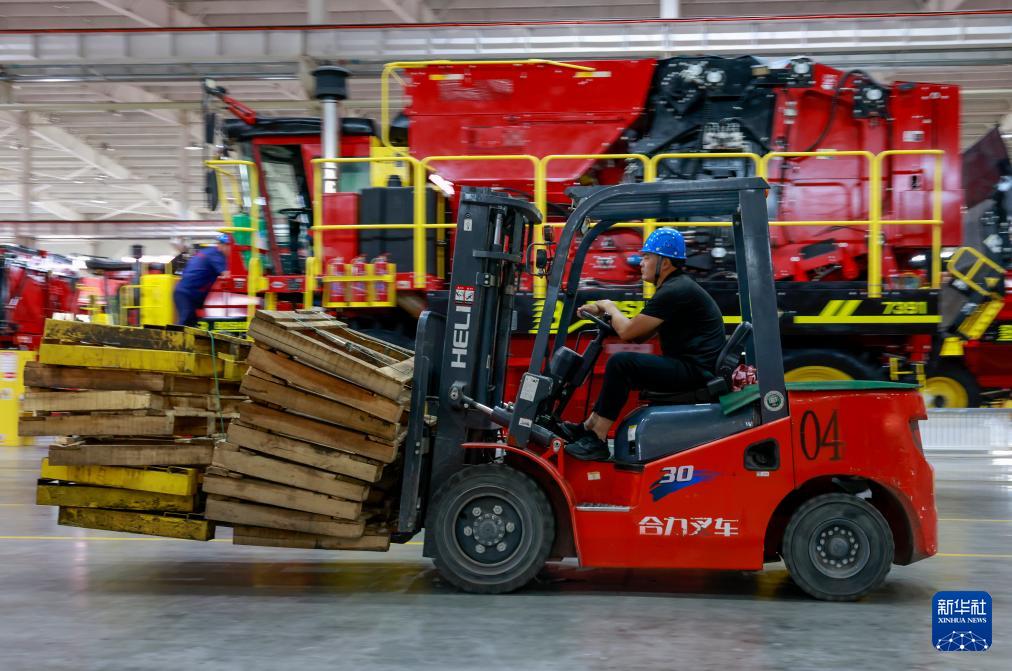 7月29日,工人在新疆缽施然智能農機股份有限公司的采棉機生產車間駕駛叉車運送配件。