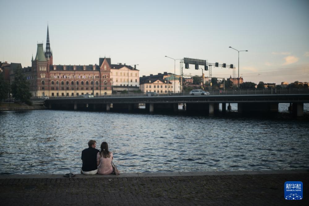7月25日,在瑞典斯德哥爾摩,一對情侶在水邊休息。