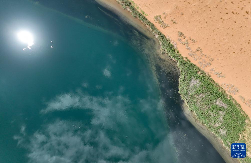 2024年7月31日在內蒙古阿拉善盟阿拉善右旗拍攝的巴丹吉林沙漠中的湖泊(無人機照片)。