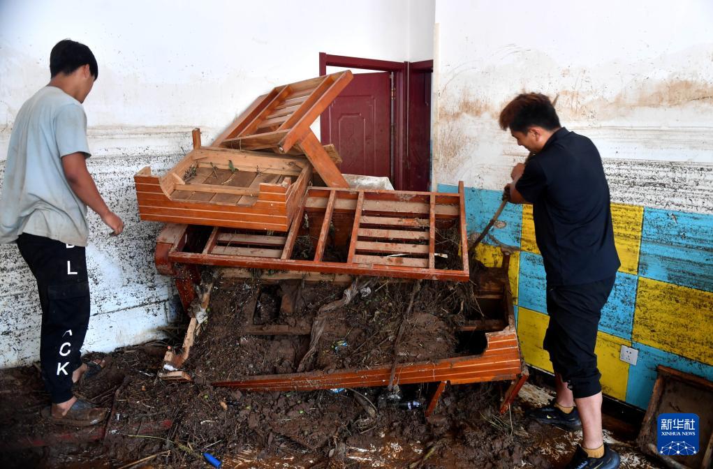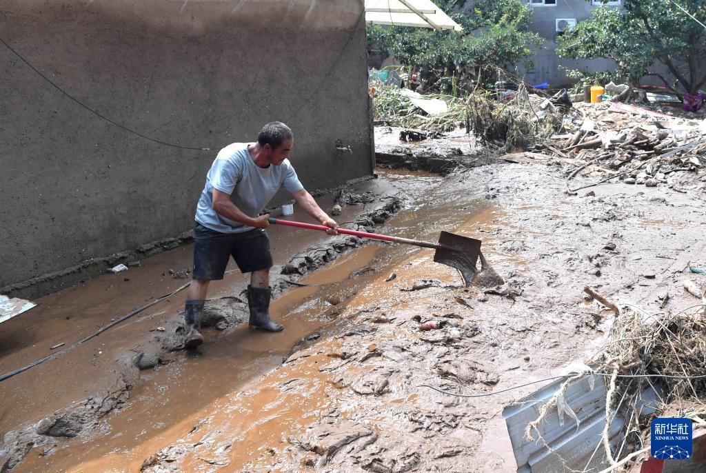 8月1日,在興隆縣六道河鎮六道溝村,村民在清理淤泥。