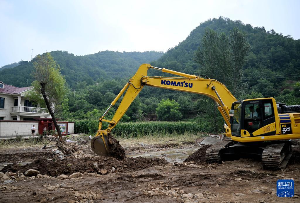8月1日,在興隆縣六道河鎮朱家溝村,工作人員駕駛工程車輛清理石塊。