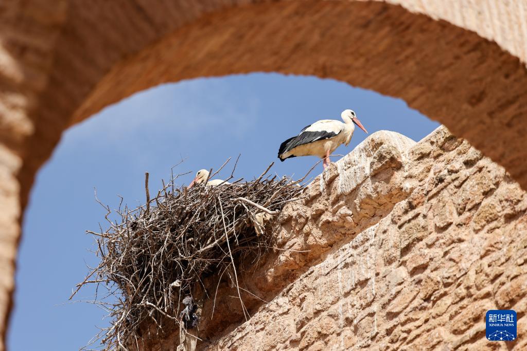 這是8月1日在摩洛哥首都拉巴特拍攝的棲居在舍拉考古遺址的鸛鳥。