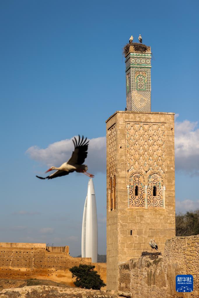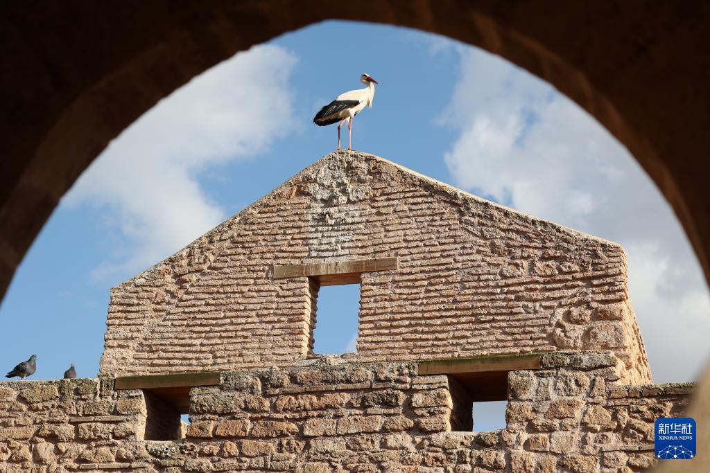 這是2月16日在摩洛哥首都拉巴特拍攝的棲居在舍拉考古遺址的鸛鳥。