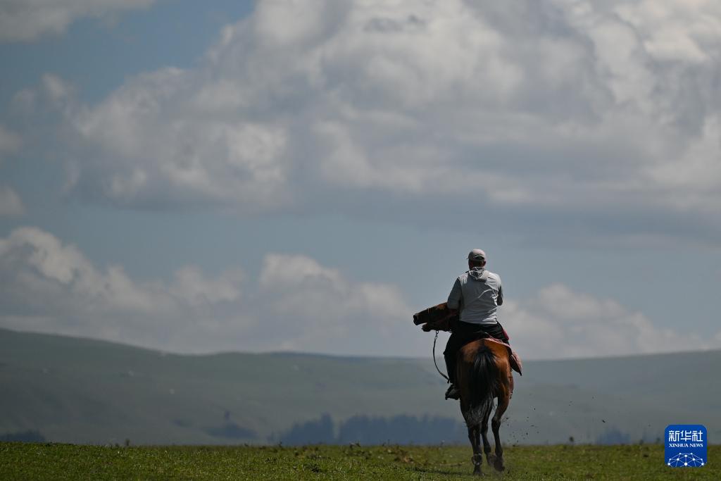 8月3日,那拉提草原馬隊的騎手騎著馬匹準備迎接游客。