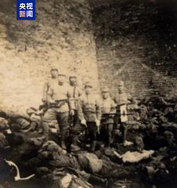 日軍士兵手持步槍、刺刀和日本旗,站在中國(guó)人的尸體旁炫耀;紫金山下被日軍屠殺的中國(guó)人尸體堆積如山;日軍在中華門(mén)懸掛“祝南京陷落”等大幅標(biāo)語(yǔ)……