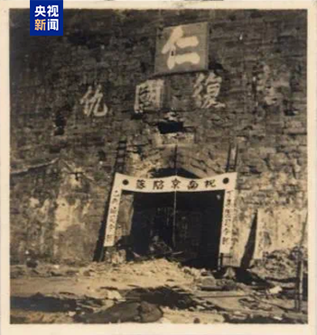 △日軍侵占南京后,在中華門(mén)掛上了“祝南京陷落”等大幅標(biāo)語(yǔ)