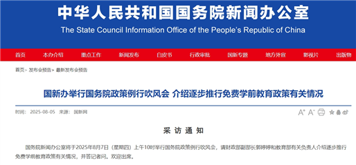據國新網發布,國務院新聞辦公室將于2025年8月7日(星期四)上午10時舉行國務院政策例行吹風會,請財政部副部長郭婷婷和教育部有關負責人介紹逐步推行免費學前教育政策有關情況,并答記者問。