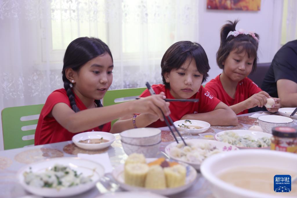 7月25日,位于新疆和田地區(qū)策勒縣亞博依村國(guó)網(wǎng)新疆電力有限公司駐策勒縣工作隊(duì)的食堂里,帕提曼罕·排日海提(左)和小伙伴們?cè)诔允迨灏⒁虃円淮笤绨玫乃托酗溩印?/span>