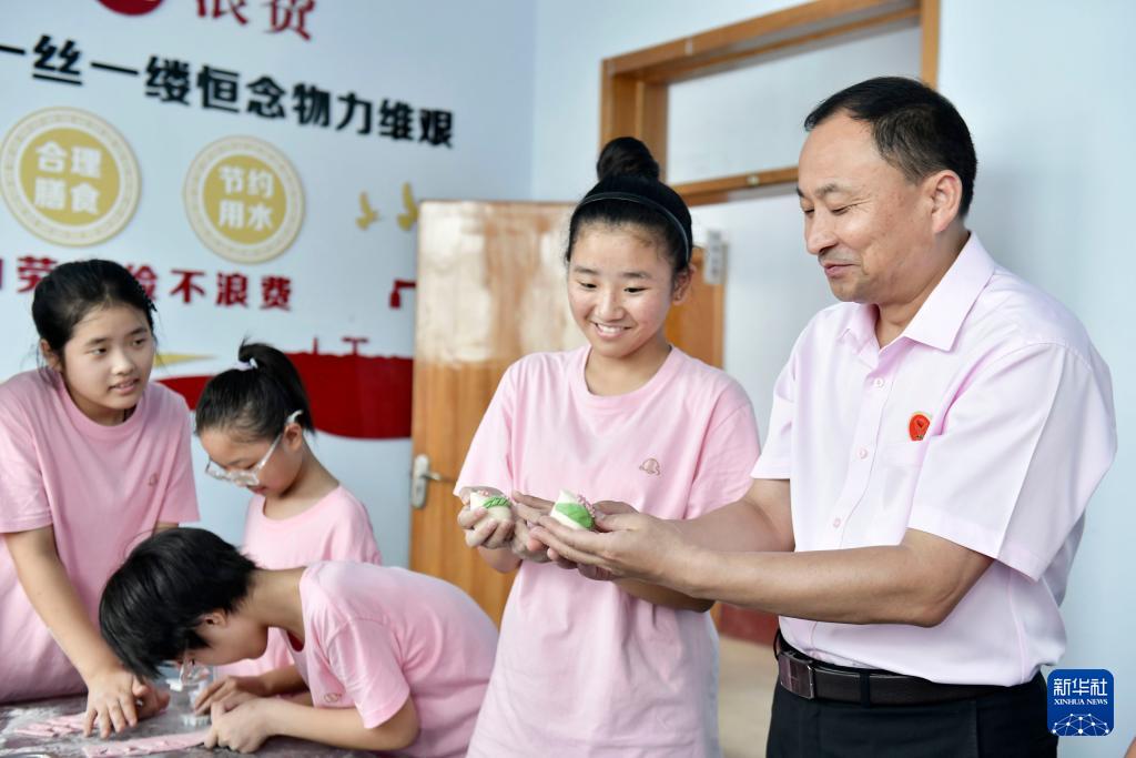8月5日,在臨沂市臨沭縣孤困兒童心靈家園,徐軍(右一)和孩子們一起做面點(diǎn)。