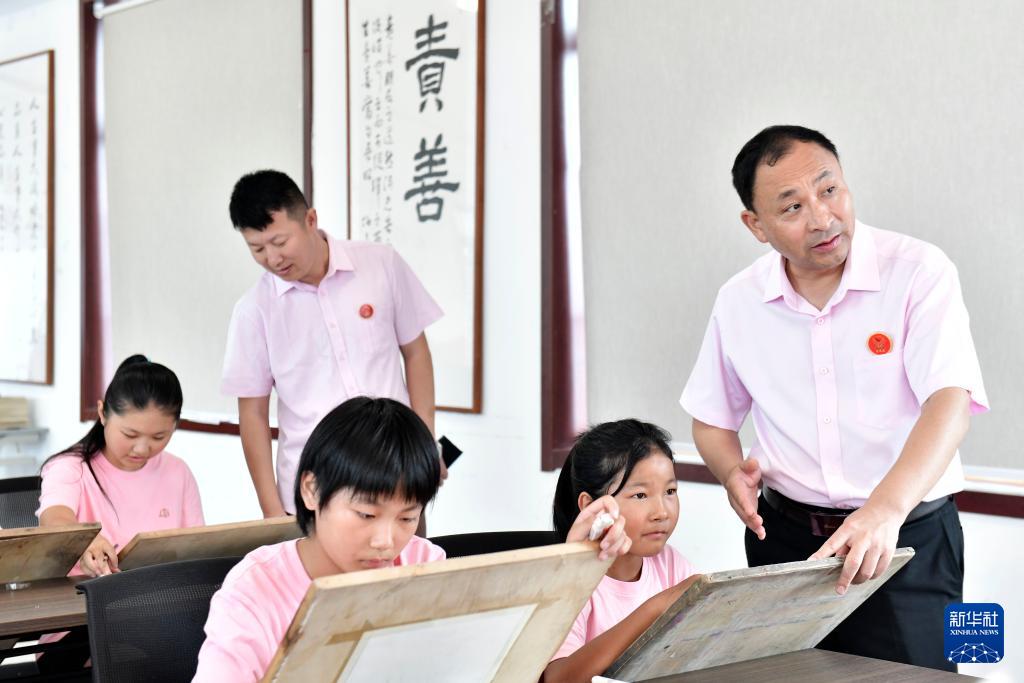 8月5日,在臨沂市臨沭縣孤困兒童心靈家園,徐軍(右一)陪伴孩子們學(xué)畫畫。