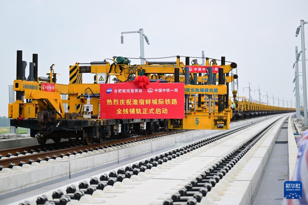 當日,在淮宿蚌城際鐵路鋪軌施工現場,中鐵一局施工人員將首對500米長鋼軌鋪設在無砟軌道上,這標志著淮宿蚌城際鐵路全線開始鋪軌。