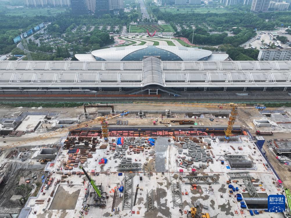 這是8月6日拍攝的新建上海至南京至合肥高鐵南通站站房建設現場(無人機照片)。