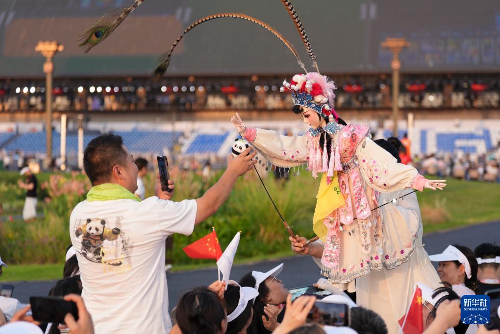 8月7日,觀眾在開幕式前與表演者互動。