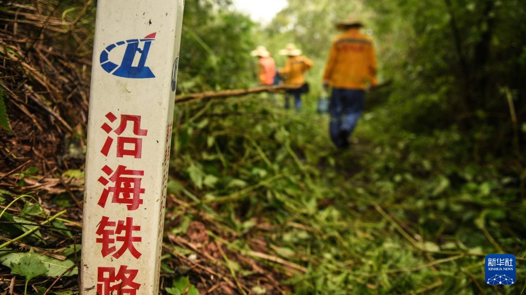 這是欽州電務段鐵路通信工巡視通信直放站光纜徑路走向,并對徑路雜草進行砍青(8月6日攝)。