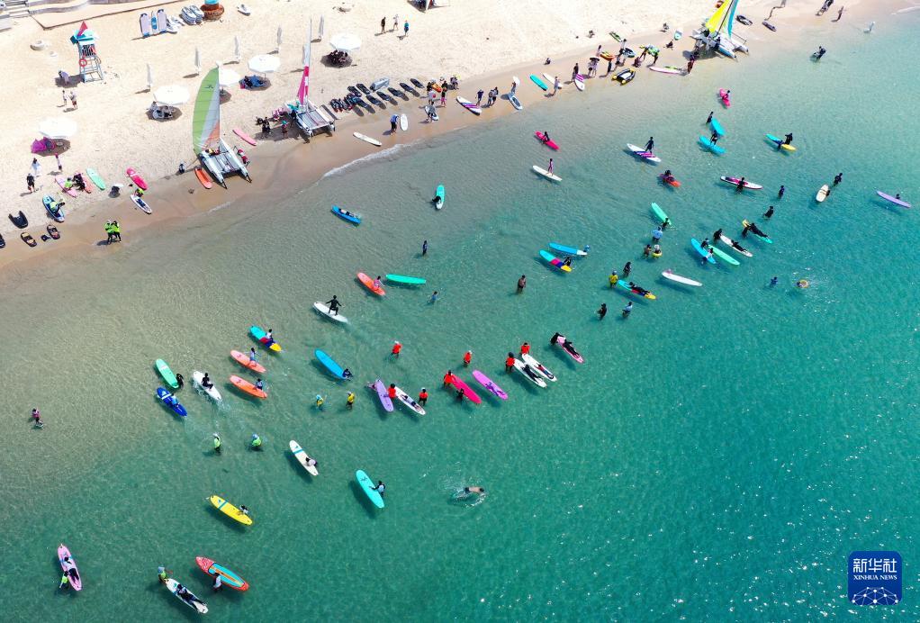 8月10日,游客在三亞市后海村附近海域沖浪嬉水(無人機照片)。
