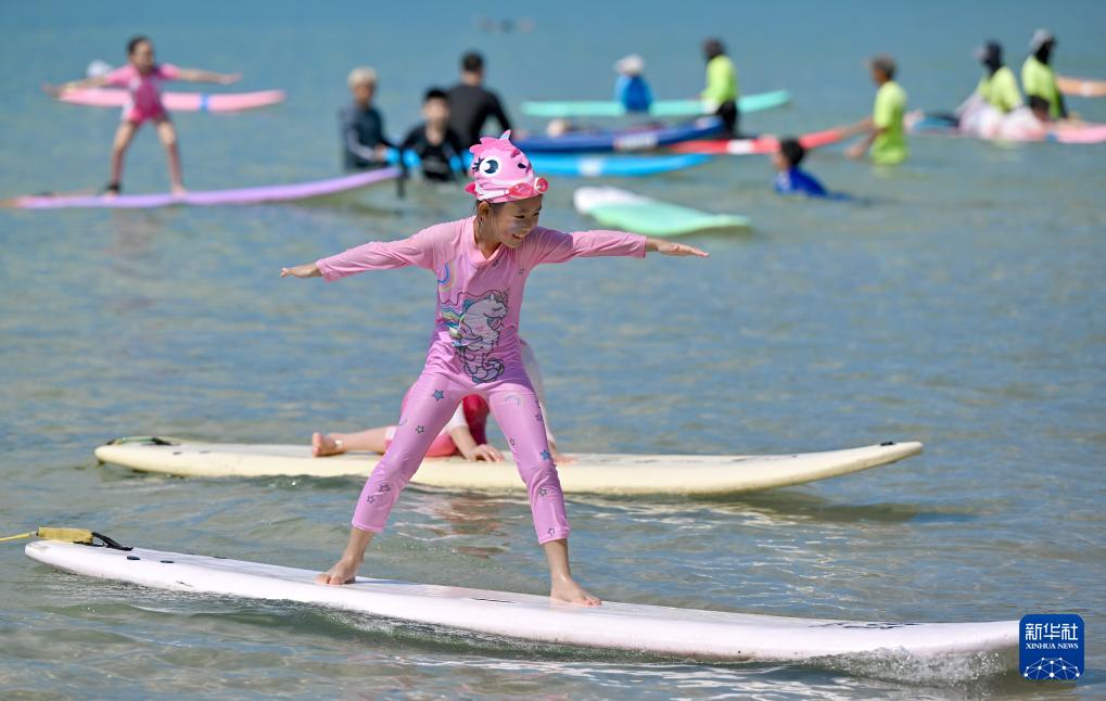 暑期,許多游客來到海南三亞,學習體驗沖浪,感受與海共舞的樂趣。